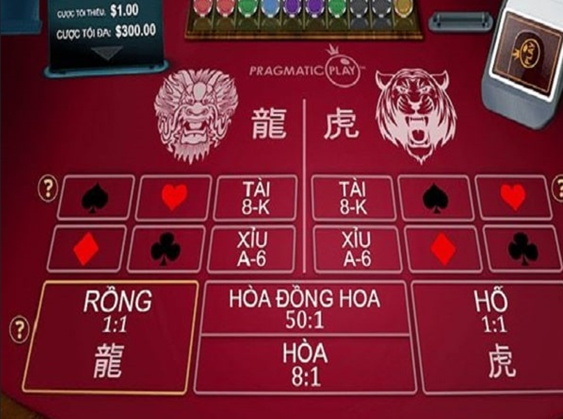 - Trên bàn chơi, bạn sẽ thấy ba lựa chọn cược: Rồng (Dragon), Hổ (Tiger), và Hòa (Tie).